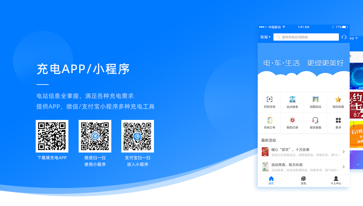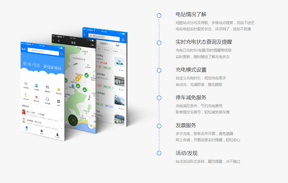 提供掃碼充電、電站查詢、消息提醒、